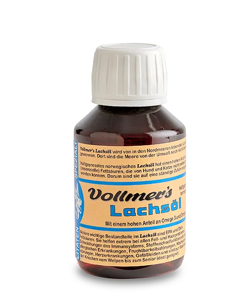 Ein Gesundbrunnen für Hunde und Katzen: Vollmer’s kaltgepresstes, norwegisches Lachsöl ist reich an essenziellen Fettsäuren, die Hunde und Katzen von Natur aus nicht selber bilden können. Deshalb sind sie auf eine Zufuhr dieser Fettsäuren angewiesen. Dem Futter zugemengt, sorgt das Öl für ein glänzendes Fell, stabile Knochen und stärkt das Immunsystem. Vollmer’s Lachsöl wird aus Lachsen gewonnen, die in den Nordmeeren leben.