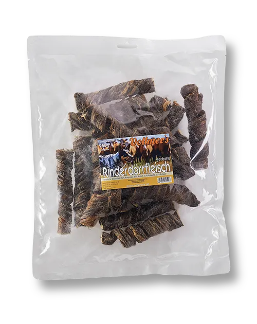 Rind ist bei vielen Hunden sehr beliebt, daher kommt unser schonend luftgetrocknetes & gedrehtes Dörrfleisch bei Groß und Klein super an.