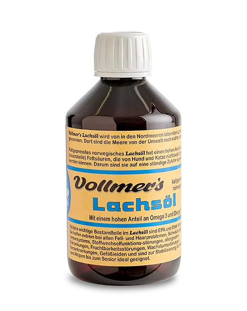 Ein Gesundbrunnen für Hunde und Katzen: Vollmer’s norwegisches Lachsöl ist reich an essenziellen Fettsäuren, die Hunde und Katzen von Natur aus nicht selber bilden können. Deshalb sind sie auf eine Zufuhr dieser Fettsäuren angewiesen. Dem Futter zugemengt, sorgt das Öl für ein glänzendes Fell, stabile Knochen und stärkt das Immunsystem. Vollmer’s Lachsöl wird aus Lachsen gewonnen, die in den Nordmeeren leben.