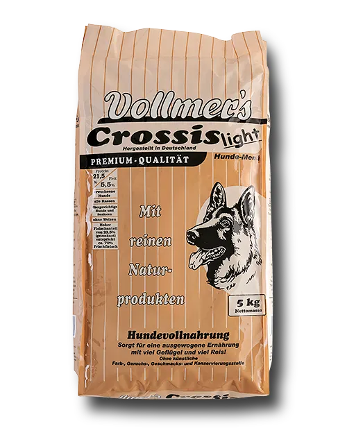 Leicht verdaulich und bekömmlich: Vollmer’s Crossis Light, als gut portionierbare Vollnahrung extrudiert, ist für Hunde aller Rassen und für alternde, übergewichtige und empfindliche Hunde ideal. Die ausgewogene Zusammenstellung der Inhaltsstoffe mit reduziertem Energiegehalt macht dieses Hundefutter zu einem Spitzenprodukt. Schmackhaftes Geflügelfleisch, Gemüse und Getreide – wobei auf Weizen verzichtet wird – fördern die Gesundheit des Tieres.